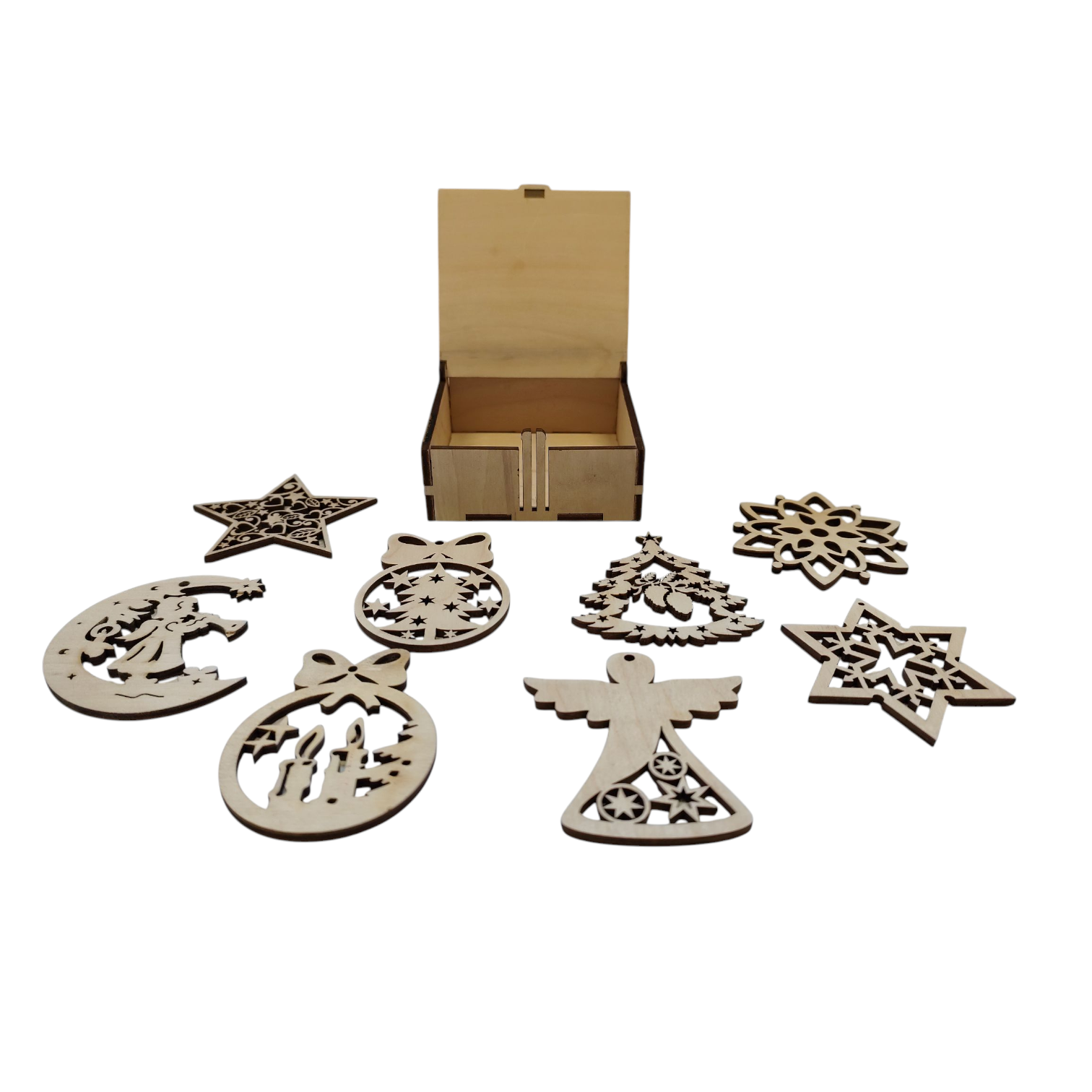Táto krásna sada drevených vianočných ozdôb je dokonalým doplnkom na každý vianočný stromček, girlandu alebo zimnú dekoráciu v domácnosti. V balení sa nachádza 8 rôznych ozdôb – hviezdy, anjelik, stromčeky, mesačný motív, guľôčky a ďalšie precízne tvarované vzory.