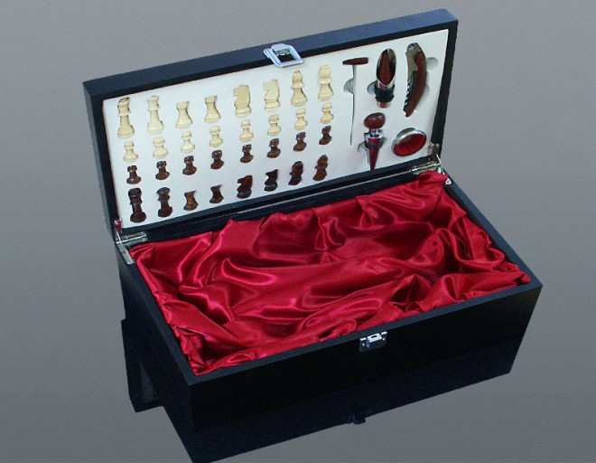 Drevená krabička v farbe, ktorá skrýva všetko potrebné náčinie pre sommeliera.