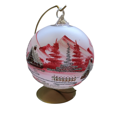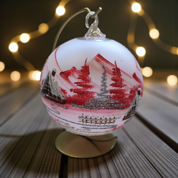 Pocíťte pokoj zimnej krajiny s nádhernou sklenenou guľou na sviečku. Táto elegantná ručne maľovaná dekorácia zachytáva zasneženú prírodu a tiché čaro zimného večera. Kombinácia jemných bielych a strieborných tónov s trblietavými akcentmi vytvára efekt iskriaceho snehu, ktorý ožíva pri svetle sviečky.