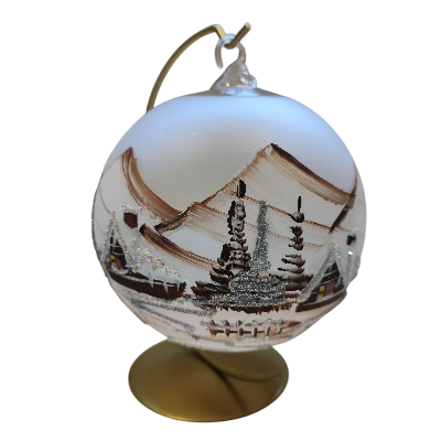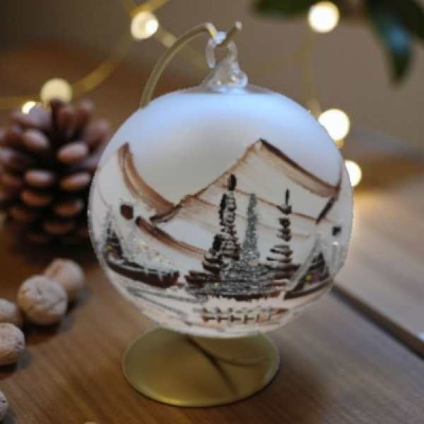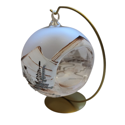 Každá guľa je originál – precízne maľovaná s použitím trblietavých detailov, ktoré evokujú jemný lesk čerstvého snehu. Stabilný kovový stojan so zlatým odtieňom dodáva elegantný vzhľad a istotu pri používaní. Ideálna ako súčasť vianočnej výzdoby, romantického večera či ako darček pre niekoho výnimočného. 🌠