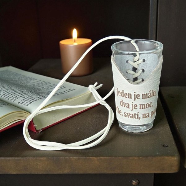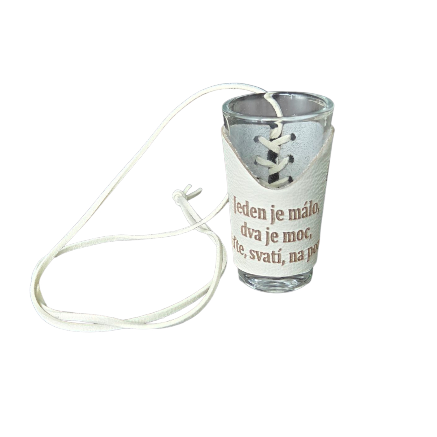 Sklenený štamperlík s koženým obalom – Jeden je málo, dva je moc, príďte svätí na pomoc