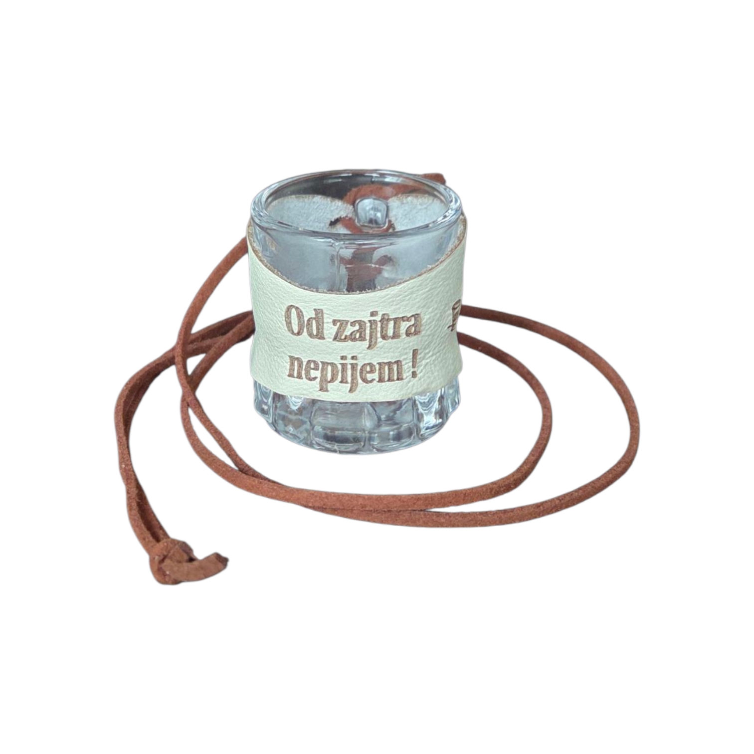 🥃 Sklenený štamperlík s koženým obalom – Od zajtra nepijem!