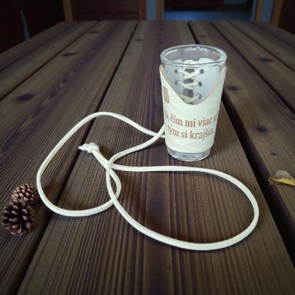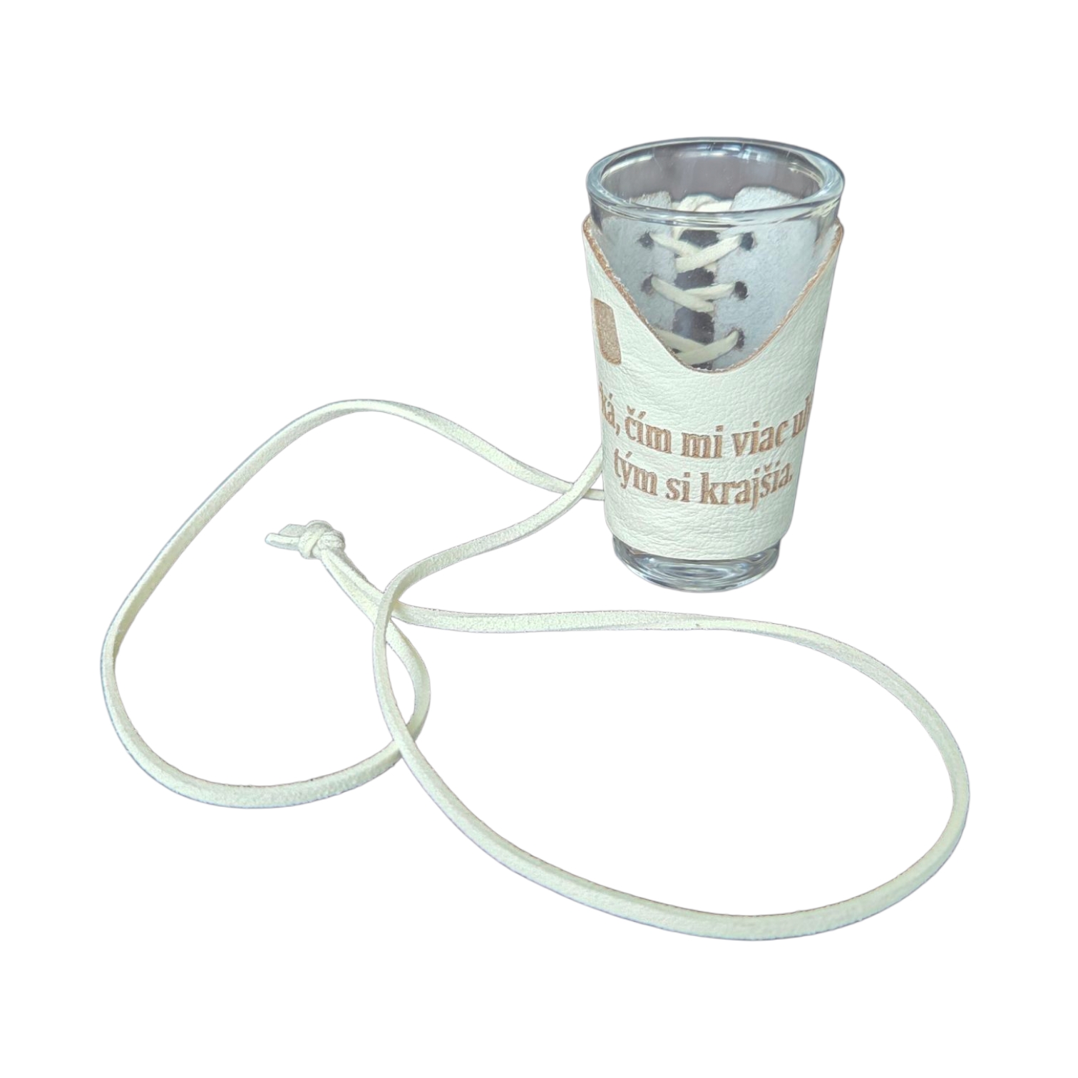 Vyrobený z kvalitného číreho skla, oblečený do pravého koženého obalu a doplnený šnúrkou na krk, aby si ho mal vždy po ruke. Každý kus je originálny, ručne vyrábaný slovenský produkt, ktorý spája remeselnú tradíciu a zmysel pre humor.