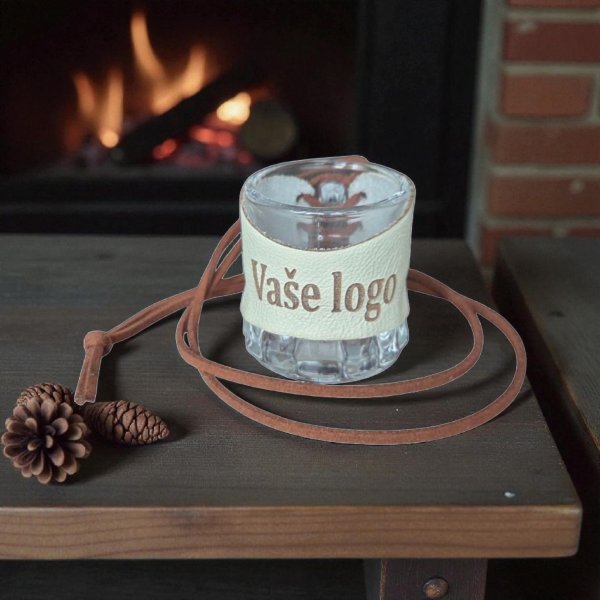 Sklenený štamperlík s koženým obalom – Vaše logo 🥃