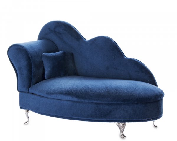 Tmavomodrá šperkovnica v tvare nábytku so zrkadlom.