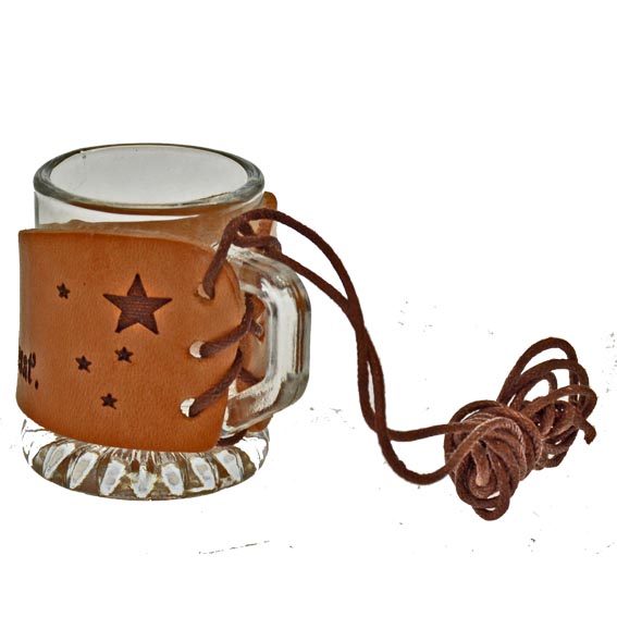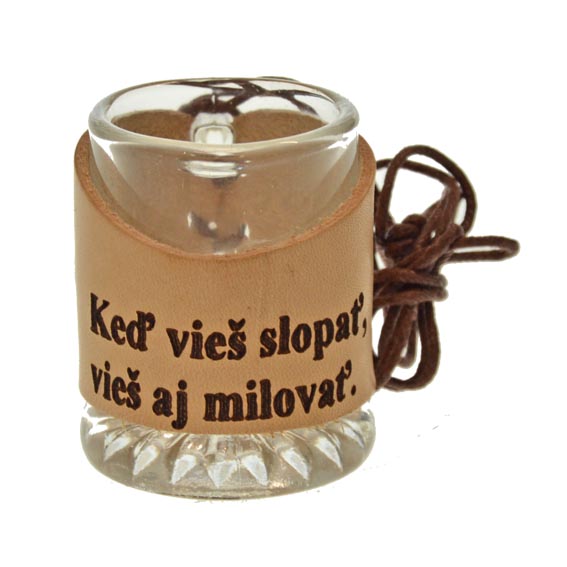 Mimoriadný pohárik zo skla v koži (štamperlík) na alkohol pre mužov - Keď vieš slopať, vieš aj milovať s koženou šnúrkou na krk.