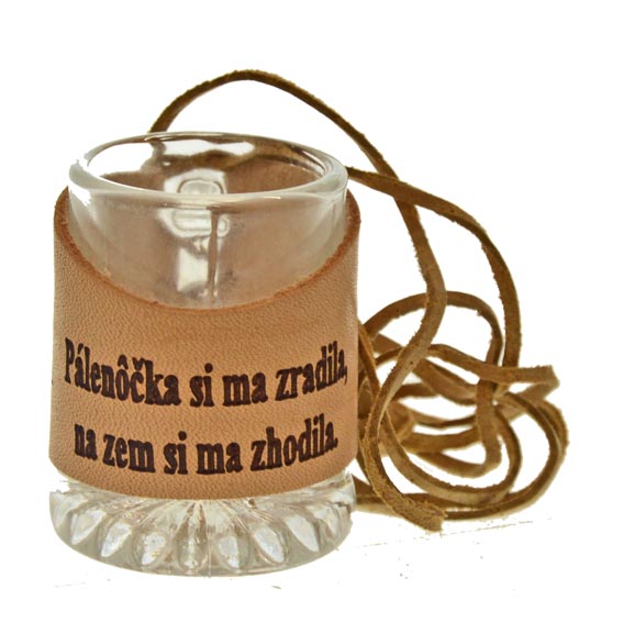 Jedinečný pohárik zo skla v koži (štamperlík) na alkohol pre chlapov - Pálenôčka si ma zradila, na zem si ma zhodila s koženou šnúrkou na krk.