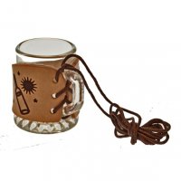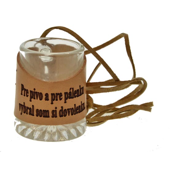 Originálny pohárik zo skla v koži (štamperlík) na alkohol pre pánov - Pre pivo a pre pálenku vybral som si dovolenku s koženou šnúrkou na krk.