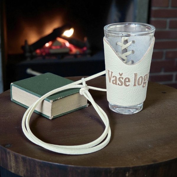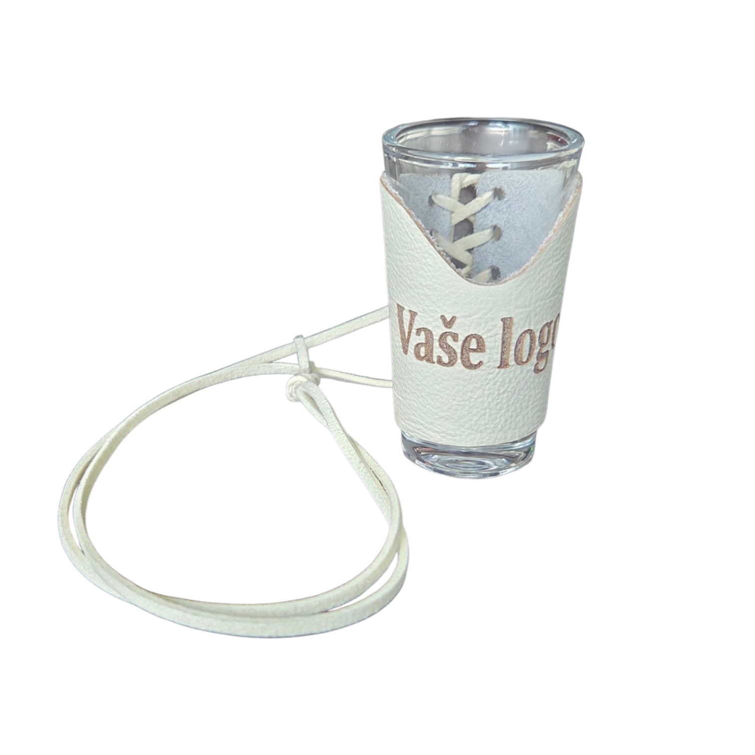 Sklenený štamperlík s koženým obalom – Vaše logo 🥃