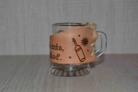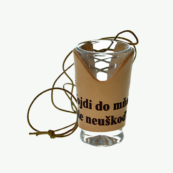 Sklenený pohárik v koži (štamperlík) na alkohol pre chlapov - Vojdi do mňa, ale neuškoď s koženou šnúrkou na krk.