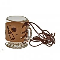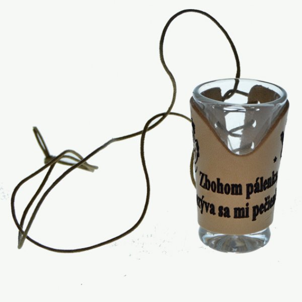 Mimoriadný pohárik zo skla v koži (štamperlík) na alkohol pre oteckov a bratov - Zbohom pálenka, ozýva sa mi pečienka s koženou šnúrkou na krk.