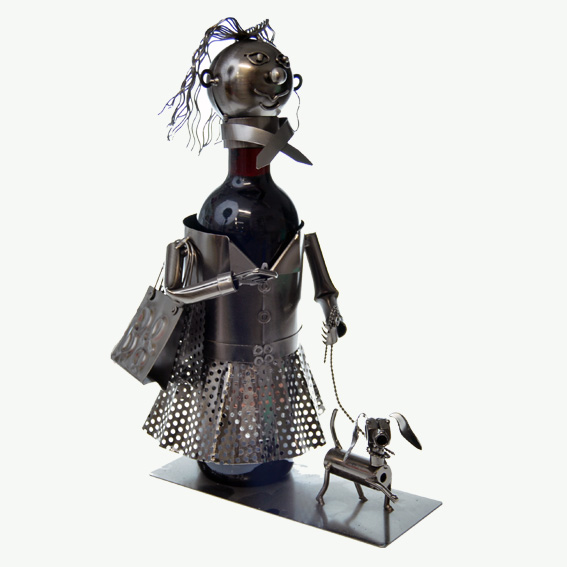 Netradičný a originálny darček do každej domácnosti kde si potrpia na štýlové bytové doplnky a dobré vínko. Originálny kovový stojan na fľašku na žena so psom