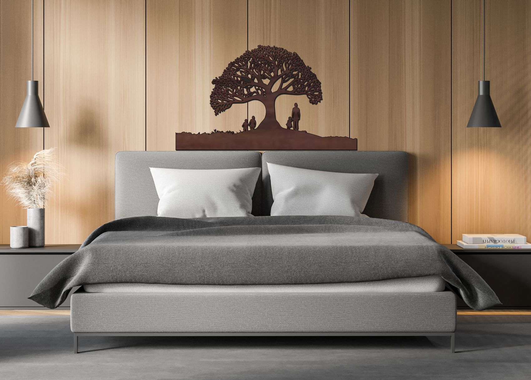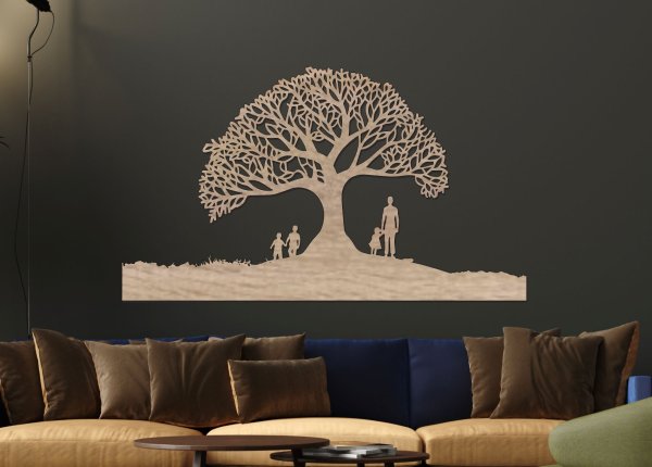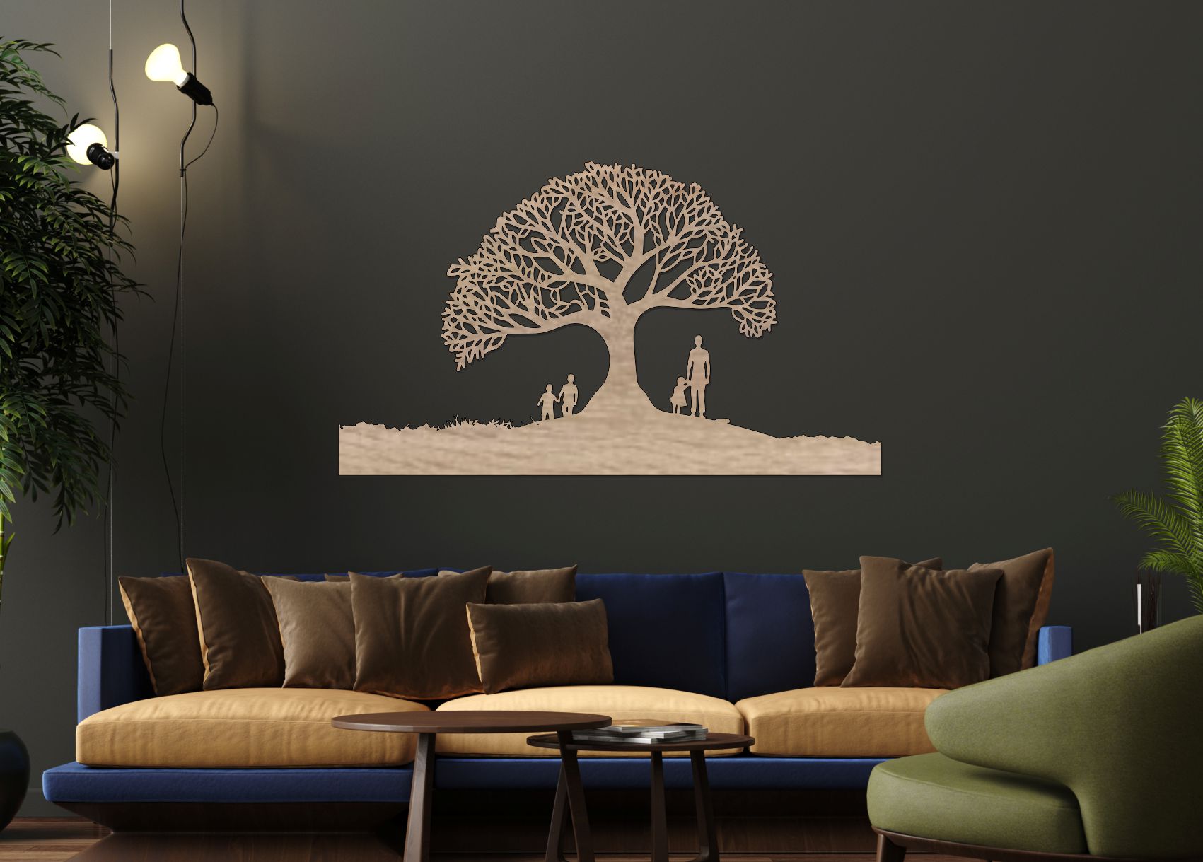 postavy pod stromom zdôrazňujú hodnotu domova a blízkosti.