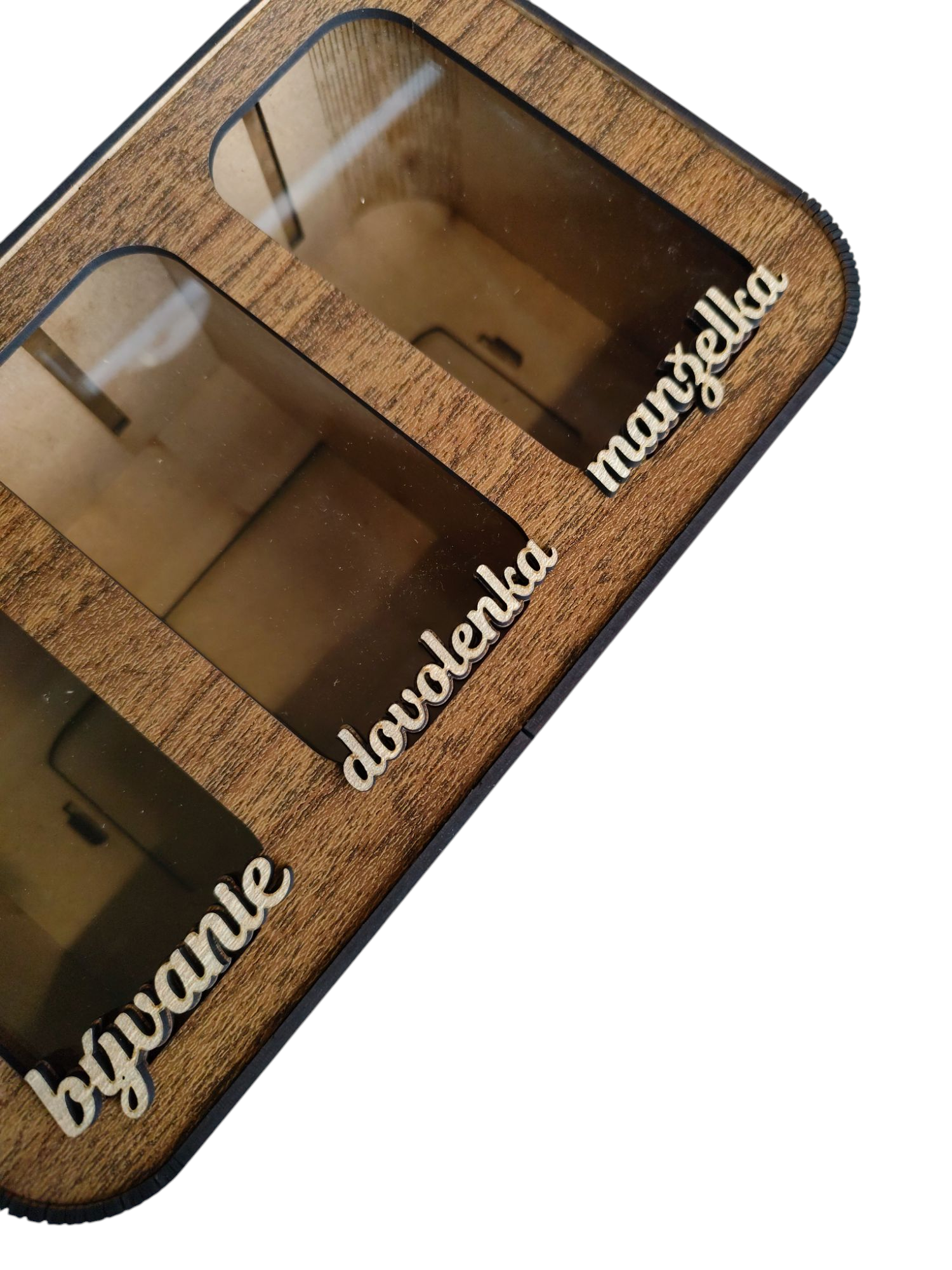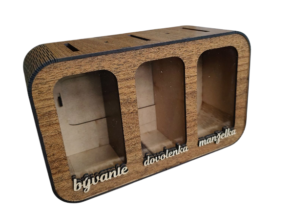 Táto drevená pokladnička je nielen praktickým úložným priestorom, ale aj jedinečnou dekoráciou do vášho domova. Vyrobená z kvalitného dreva, ponúka možnosť personalizácie – môžete si vybrať záľuby aké vám budú pasovať, ktoré bude zdobiť jej povrch. Vďaka precíznemu spracovaniu a elegantnému dizajnu sa skvele hodí do každej domácnosti.