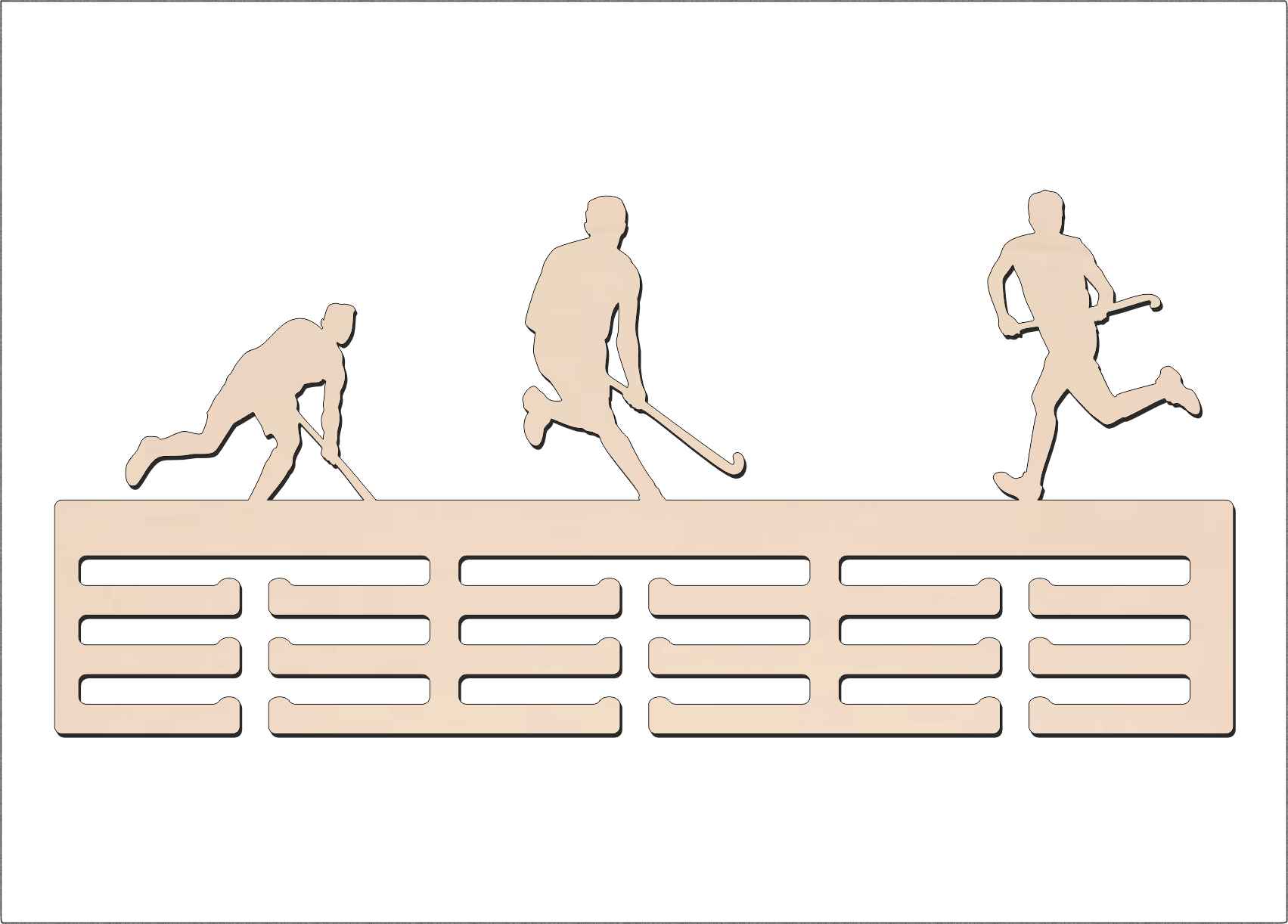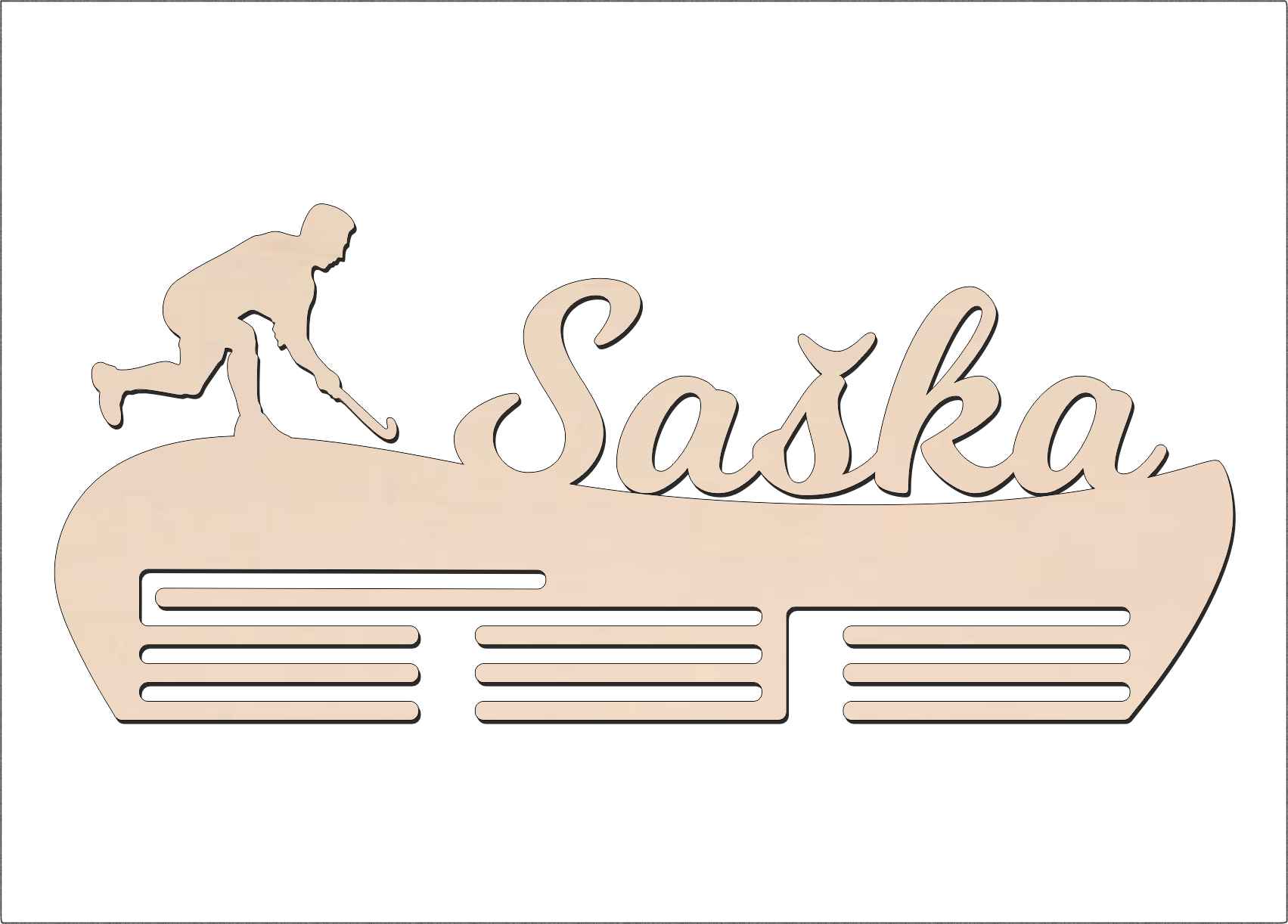 Vyrobený z kvalitného materiálu, tento vešiak na medaile je odolný a elegantný. Jeho moderný dizajn s florbalovým motívom dokonale zapadne do každého interiéru – či už do izby mladého športovca alebo do klubovej šatne.