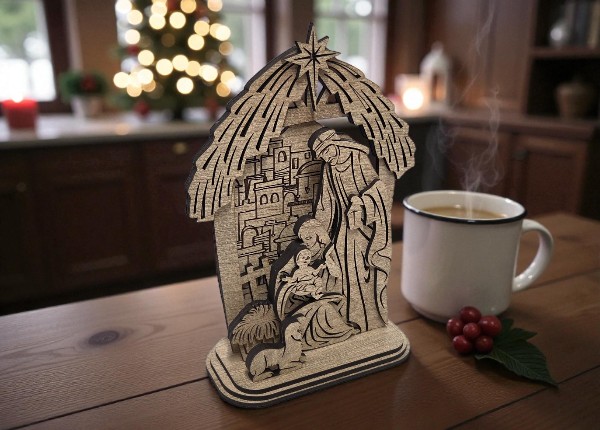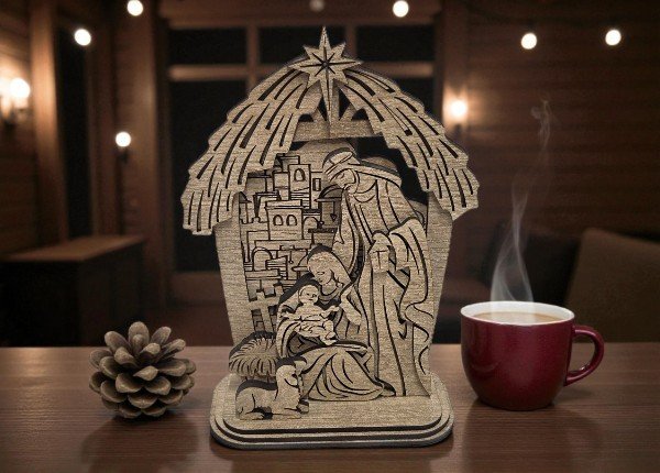 Strieška symbolizujúca jednoduchý prístrešok Betlehéma dotvára scénu a chráni rodinu, zatiaľ čo pozadie s vyobrazením mesta dodáva kompozícii hĺbku a krásny priestorový efekt 🕯🌟.