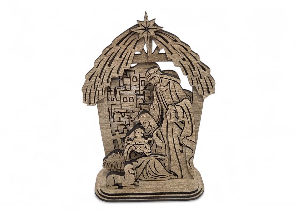 Dekorácia zachytáva jeden z najkrajších momentov vianočného príbehu – Máriu a Jozefa nežne skláňajúcich sa nad malým Ježiškom. Každá postava je precízne vyrezaná tak, aby pôsobila prirodzene, pokojne a láskavo. Jemné línie, starostlivo vytvarované tvary a cit pre detail robia z tejto dekorácie skutočné umelecké dielko.