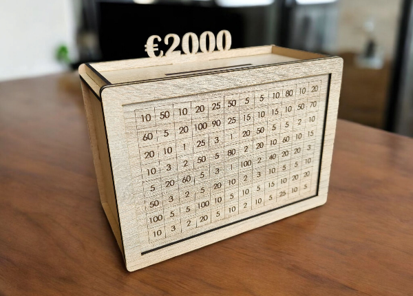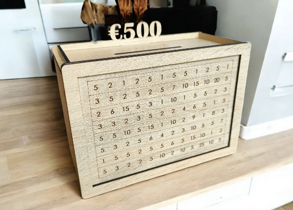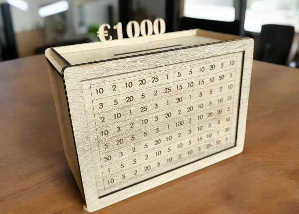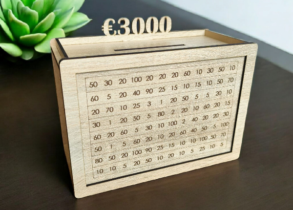 Vyrobená z kvalitného dreva, pokladnička je dostupná v rôznych dizajnoch a dekoroch, aby ladila s vaším interiérom. Môžete si vybrať varianty na šetrenie 500, 1000, 2000, 3000, 5000 alebo 10 000 eur, podľa vašich potrieb.